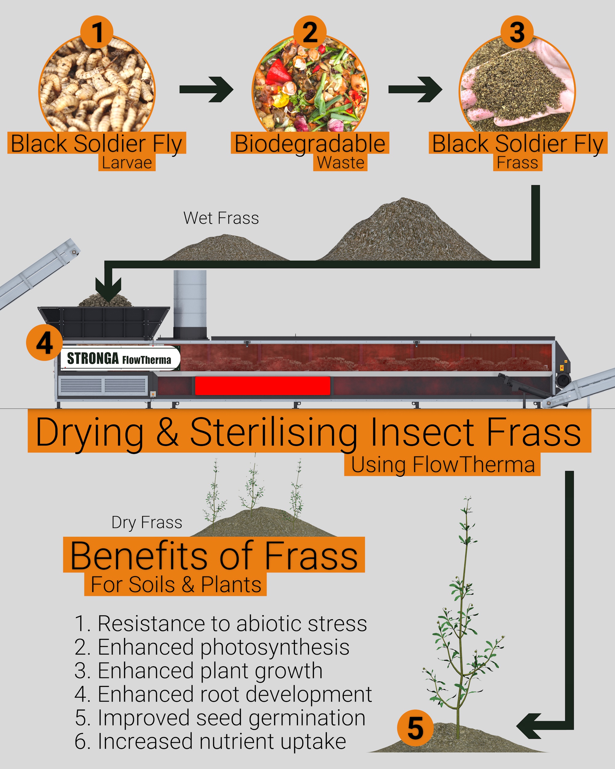 (1) Growing BSF; (2) Production of BSFL (Black Soldier Fly Larvae); (3) Larvae consumes food/organic waste (of which up to 40% of food is wasted globally); (4) Converts waste into nutrient-rich material frass (manure); (5) Larvae is separated from the frass - Outputs are insect protein (animal feed) + frass (fertiliser); (6) Frass available for pasteurisation and pelleting using FlowTherma, for sale as fertiliser.
