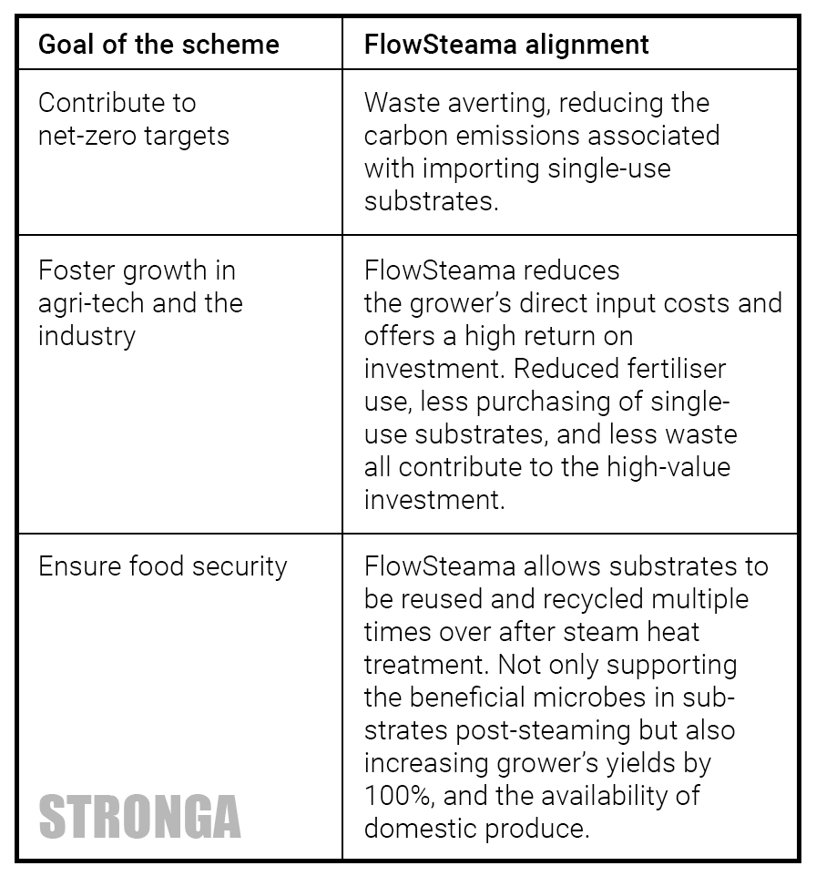 Stronga’s FlowSteama equipment aligns with the fundamentals of the EU F&V scheme, with the quality of growing substrate offering a significant influence on yield, productivity and quality of grown fruit and vegetable produce. Examples of FlowSteama’s steam pasteurisation benefits, in line with scheme compliance, are described in the table below.