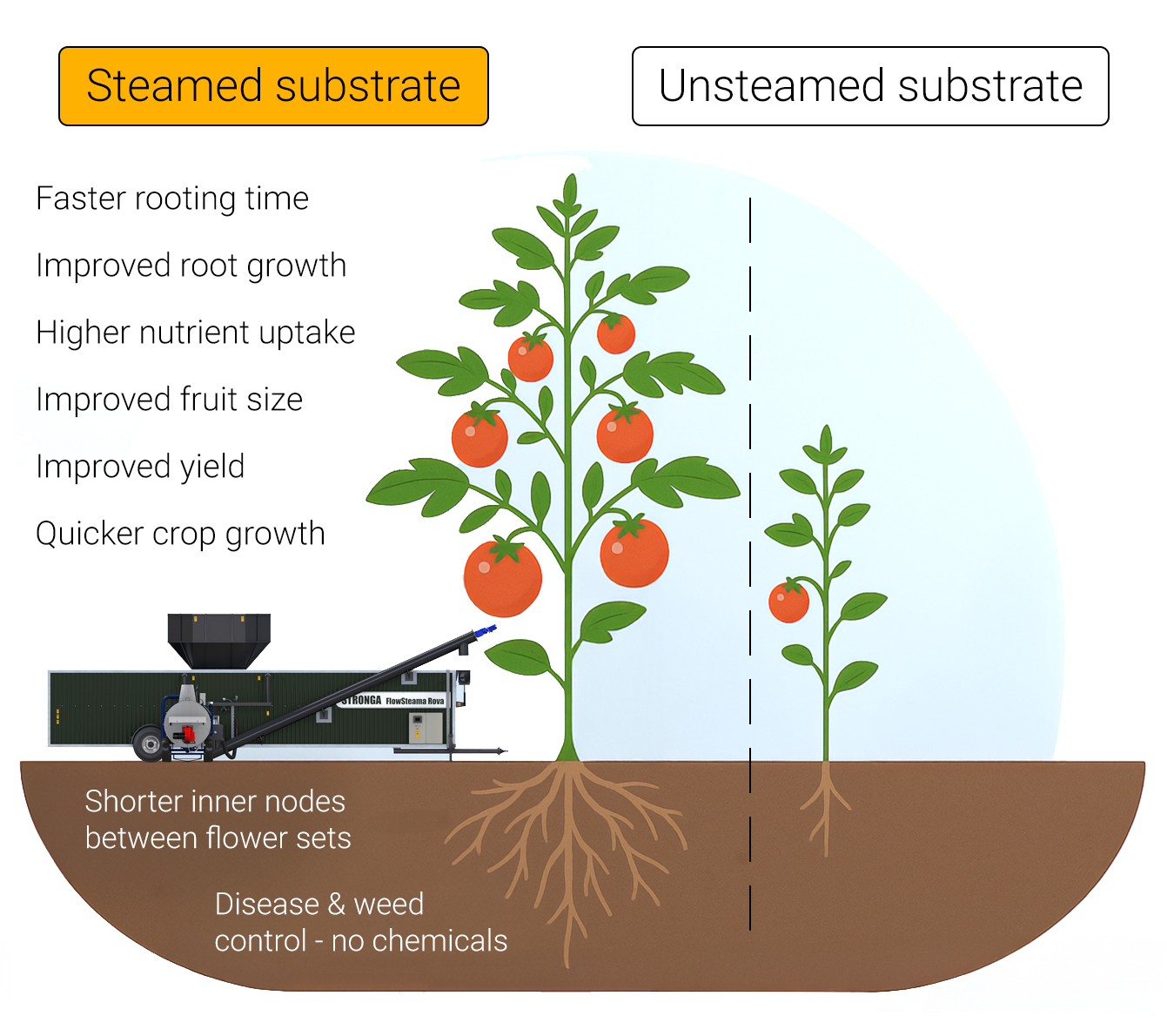 Overall, FlowSteama enhances the management of growing substrates, allowing growers to grow more with significantly lower single-use substrate costs. FlowSteama ensures growers can reuse spent substrate material, replace chemical sterilisation methods, enhance hygiene and reduce waste, contributing to improved environmental sustainability.