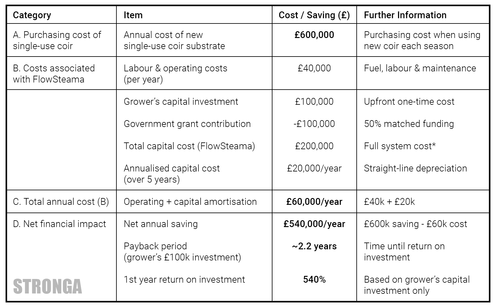 A number of FlowSteama owners have had proven success purchasing their equipment via funding schemes. In one case, a Stronga customer who had a large stockpile of spent coir enjoyed savings of £600,000/yr of the purchasing cost of virgin coir, using FlowSteama to recycle the material. The capital cost of the equipment was also match funded so the grower enjoyed a substantial ROI. The table below indicates the potential savings using FlowSteama compared to purchasing single-use, virgin substrates for each growing cycle.