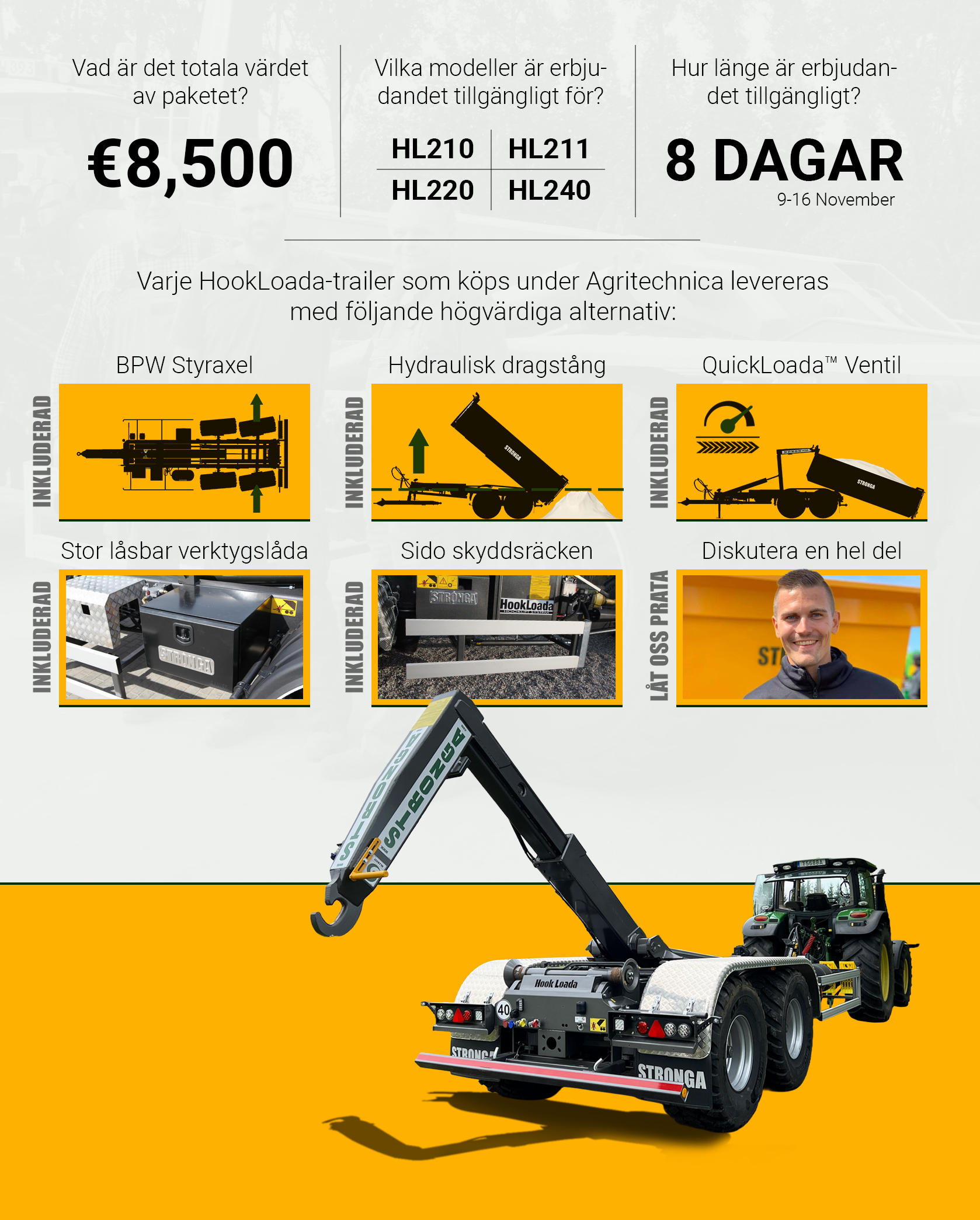 Villkor: Erbjudandet gäller endast för beställningar som bekräftas mellan 9–16 november under Agritechnica-mässan. Gäller för modellerna HL210, HL211, HL220 och HL240. Strongas standardvillkor gäller. Kontakta vårt team för fullständiga detaljer.