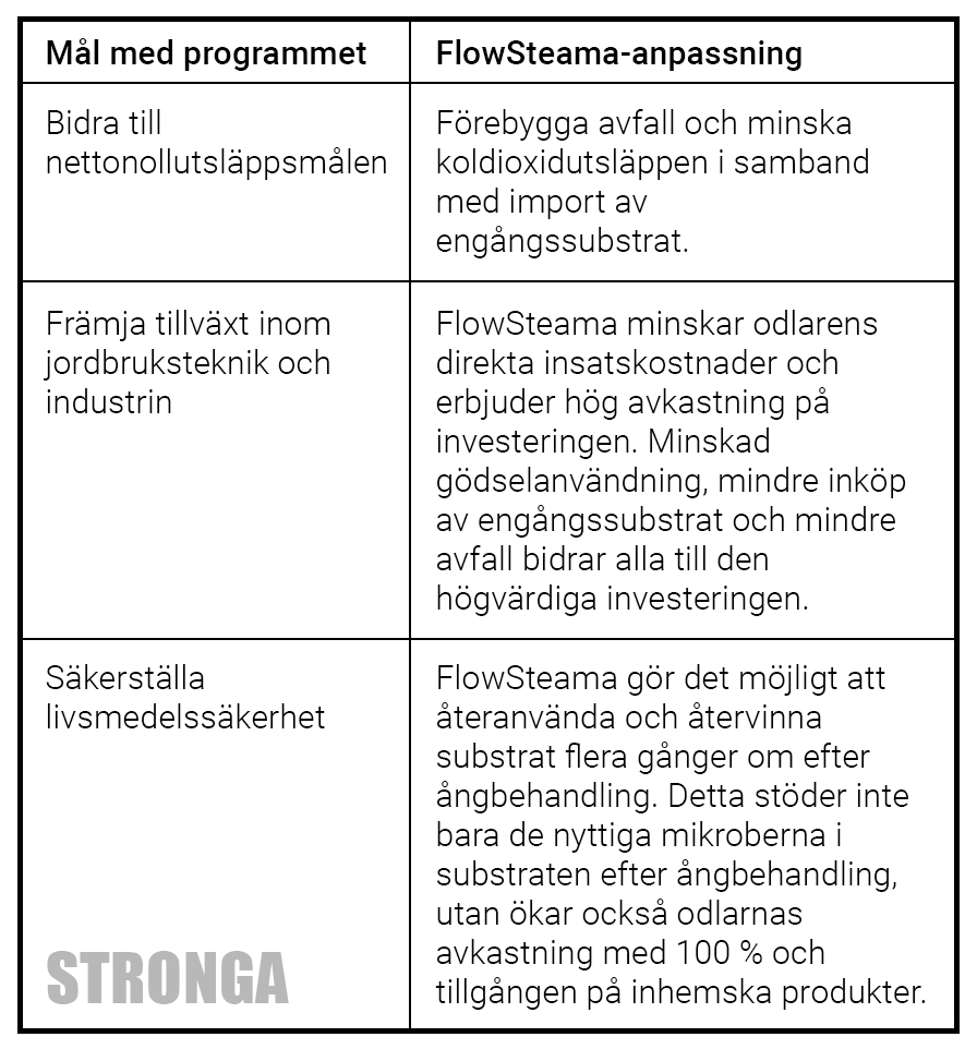 Stronga’s FlowSteama-utrustning överensstämmer med grunderna i EU:s F&V-schema, där kvaliteten på odlingssubstratet har en betydande inverkan på avkastning, produktivitet och kvalitet på de odlade frukterna och grönsakerna. Exempel på FlowSteamas fördelar med ångpastörisering, i enlighet med schemats efterlevnad, beskrivs i tabellen nedan.