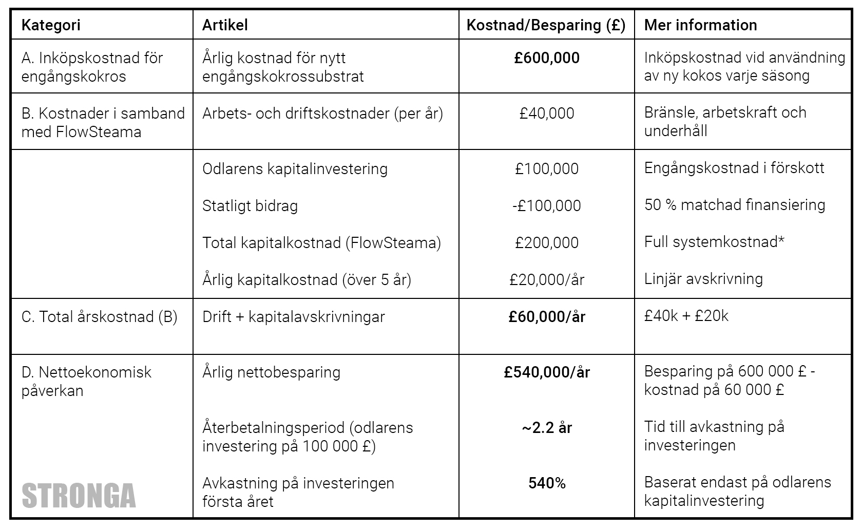 Ett antal ägare av FlowSteama har haft bevisad framgång med att köpa sin utrustning via finansieringsprogram. I ett fall kunde en Stronga-kund som hade ett stort lager av uttjänt kokosfiber spara 600 000 £ per år på inköpskostnaden för jungfrulig kokosfiber genom att använda FlowSteama för att återvinna materialet. Kapitalutgiften för utrustningen finansierades också med matchande medel, så odlaren fick en betydande avkastning på investeringen. Tabellen visar de potentiella besparingarna med FlowSteama jämfört med att köpa engångs- och jungfruliga substrat för varje odlingscykel.